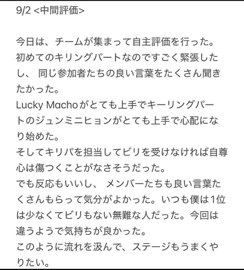初めてキリングパートを担ったカンミンくんの緊張やワクワクする思いがたくさん伝わってきます。